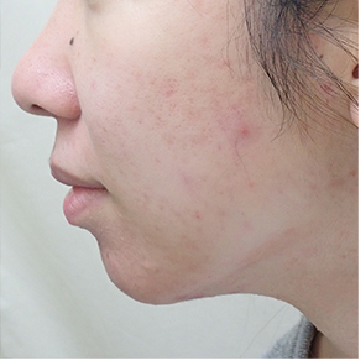 中学生からニキビで悩み、ピルの服用を開始して落ち着いたそうです。ずっと服用するのも抵抗があり止めて1年ほどたち、ニキビがまた悪化してきたのだと。炎症が長い間、広い範囲で続いているということがわかる、顔全体に強い赤みがある状態でした。