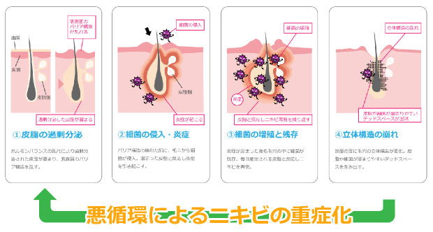 その傷が治っていないうちに、また次のニキビが出てきてしまう。さらに傷が大きくなってしまう。そのサイクルにはまってしまうと、