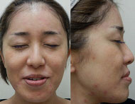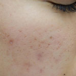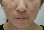 ニキビは少ないように見えるかもしれませんが、頬にはニキビが無いもののほかは全体的に炎症ニキビが点在している状態でした。もともとアトピーがあって、アトピーの症状が出やすい部分にニキビも出やすい状態でした。