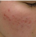 湿疹によって乾燥が強かったフェイスラインに炎症ニキビが停滞しています。