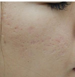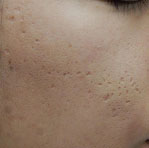 細かいくっきりしたクレーターが点々とありますね。もうニキビは出ない状態で、やっぱりどうしても気になるとのことで、フラクショナルレーザーに踏み切りました。