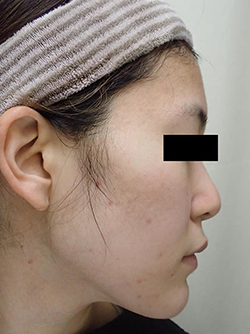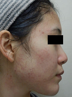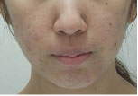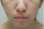 ニキビは少ないように見えるかもしれませんが、頬にはニキビが無いもののほかは全体的に炎症ニキビが点在している状態でした。もともとアトピーがあって、アトピーの症状が出やすい部分にニキビも出やすい状態でした。