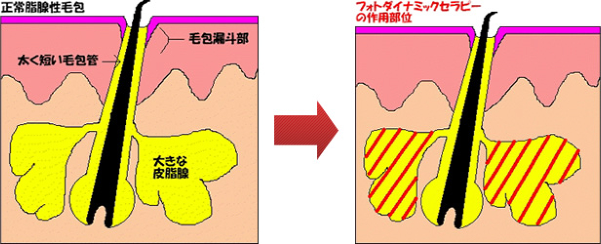 特殊な光に対して反応する薬(アミノレブリン酸)を内服すると、皮脂腺にとり込まれ、ポルフィリンという物質に代謝変換されます。