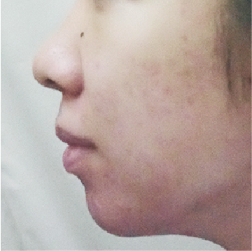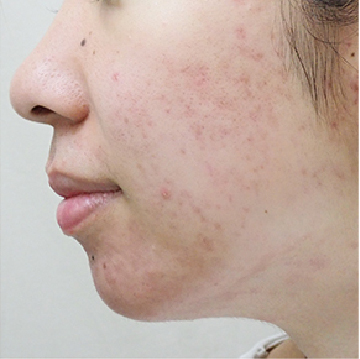 中学生からニキビで悩み、ピルの服用を開始して落ち着いたそうです。ずっと服用するのも抵抗があり止めて1年ほどたち、ニキビがまた悪化してきたのだと。炎症が長い間、広い範囲で続いているということがわかる、顔全体に強い赤みがある状態でした。