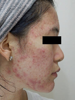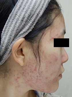 アトピーの症状が不安定で、この時は強く症状が出ていました。写真で見える赤みは、もはやニキビではなく湿疹でした。ニキビ自体はほぼなくなっており、いったんここで3週間ごとの治療は終了し、間隔をあけてみることになりました。