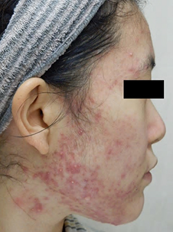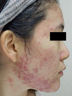写真の患者様は、完全にこのサイクルにはまってしまっており、ご本人が考えていたよりも、ニキビはかなり重症化していました。