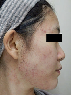 細かいくっきりしたクレーターが点々とありますね。もうニキビは出ない状態で、やっぱりどうしても気になるとのことで、フラクショナルレーザーに踏み切りました。