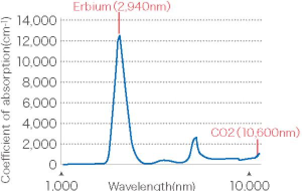 現在最も普及しているのがCO2(炭酸ガス)によるフラクショナルレーザーですが、当院では、Er:YAG(エルビウムヤグ)レーザーによるフラクショナルレーザーを導入しています。Er:YAGレーザー(波長2,940nm)は、同様の目的で用いられるCO2レーザーと比較し、約10倍の水分への吸収率があり、表皮に対してミクロン単位の蒸散(剥離)が可能で周囲にほとんど熱影響を与えないことが特徴です。